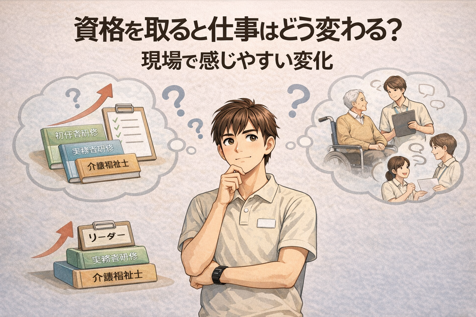 介護の仕事では、初任者研修や実務者研修、介護福祉士といった資格を取得することで、できる業務や任される役割が少しずつ変わっていきます。ただし、資格を取れば必ず働きやすくなるとは限らず、仕事内容の幅が広がることで感じ方が変わることもあります。